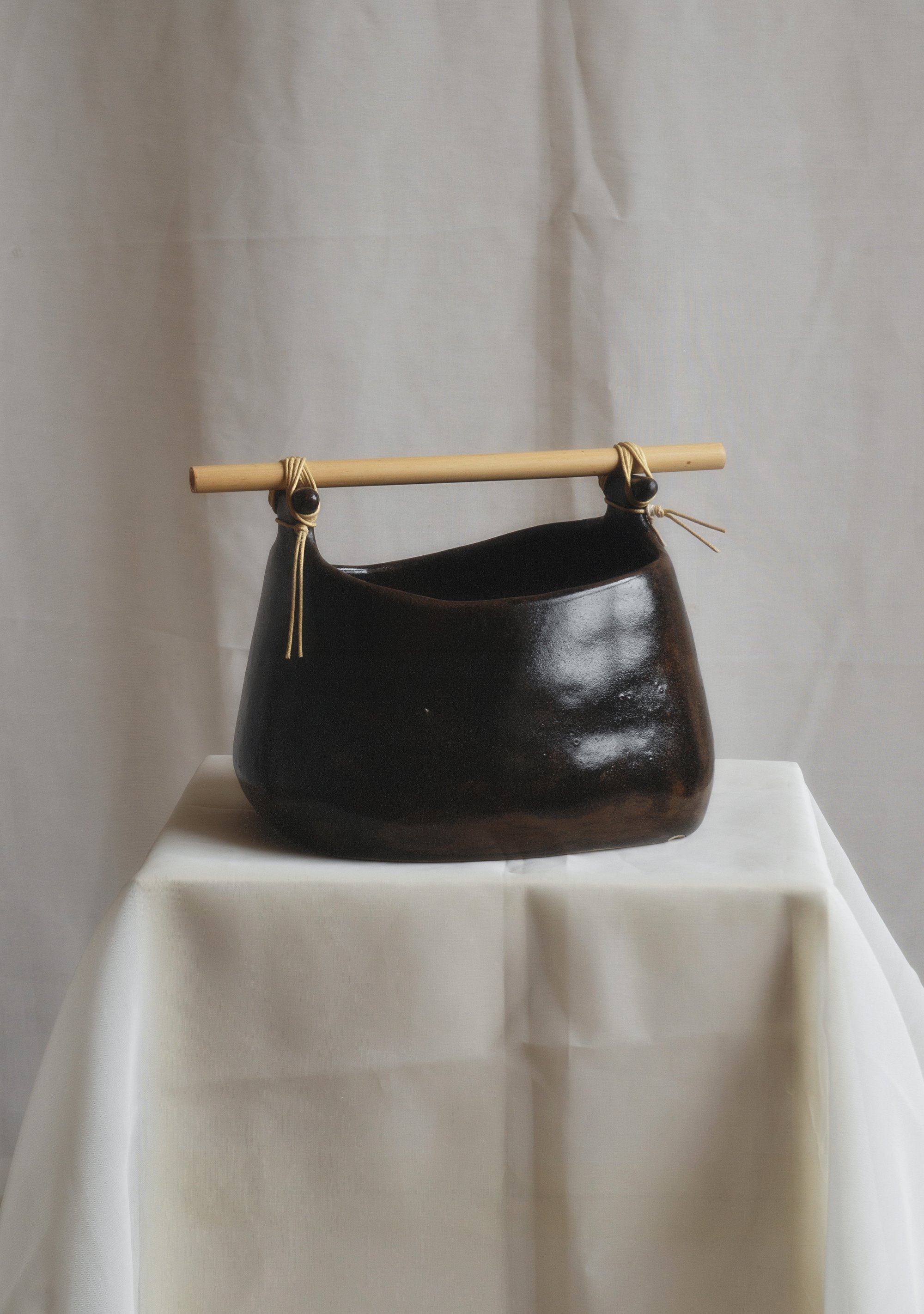 grès chamois, émail marron Tenmoku, manche bois bambou, fil coton ciré, cire d'abeille.