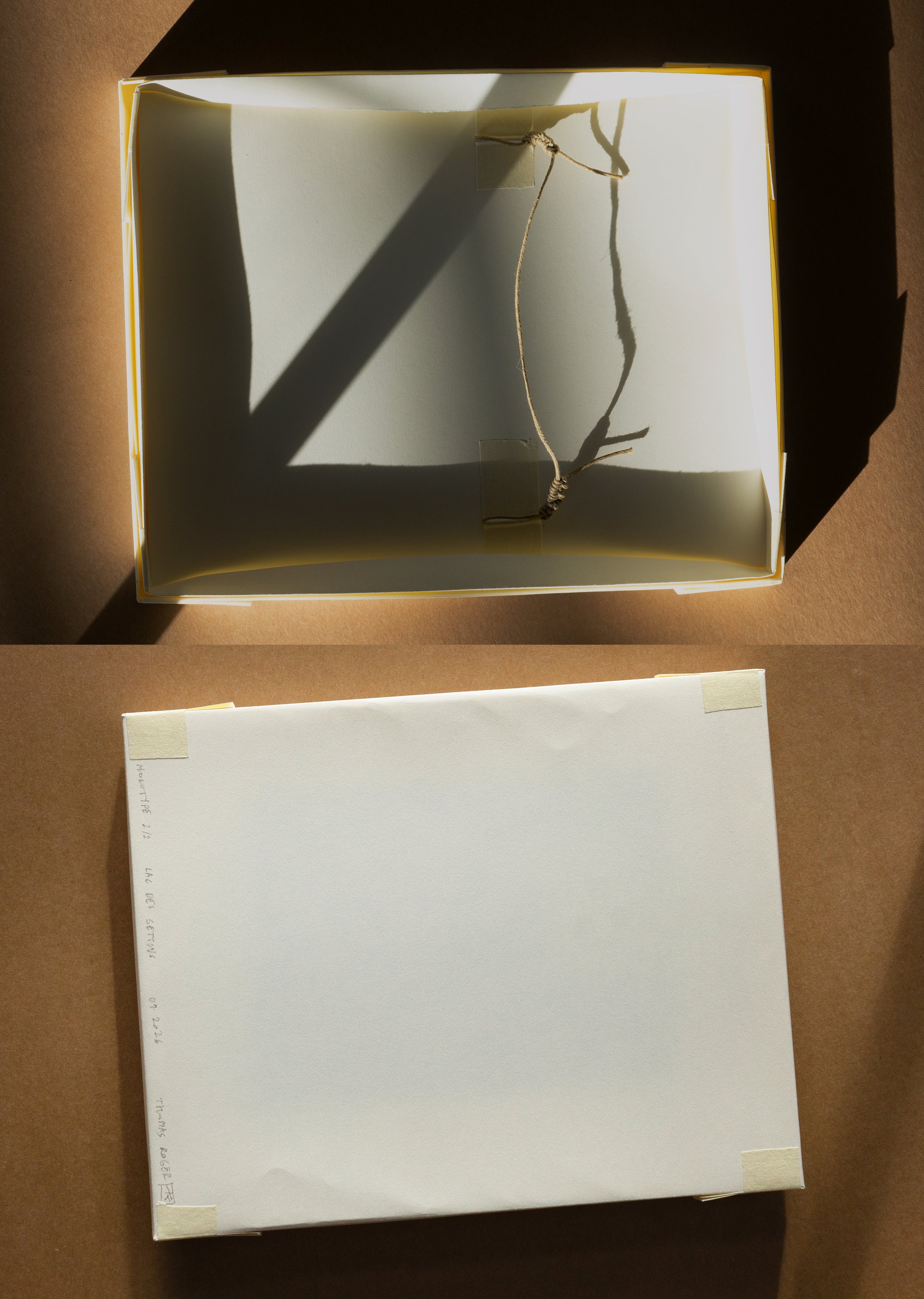 cadre papier, rubans adhésifs, fil coton ciré, dim. cadre 16,5 x 21 x 2 cm.