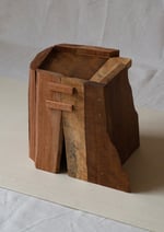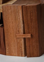 Pour cet objet, une planche est fendue à l’aide de burins. Les morceaux sont judicieusement sélectionnés en fonction des épaisseurs et dimensions nécessaires. Les essis (bardeaux de bois) sont collés et assemblés grâce à des chevilles de bois, l'élément de construction devient ornemental, comme un motif créé grâce à l'assemblage irrégulier.