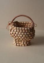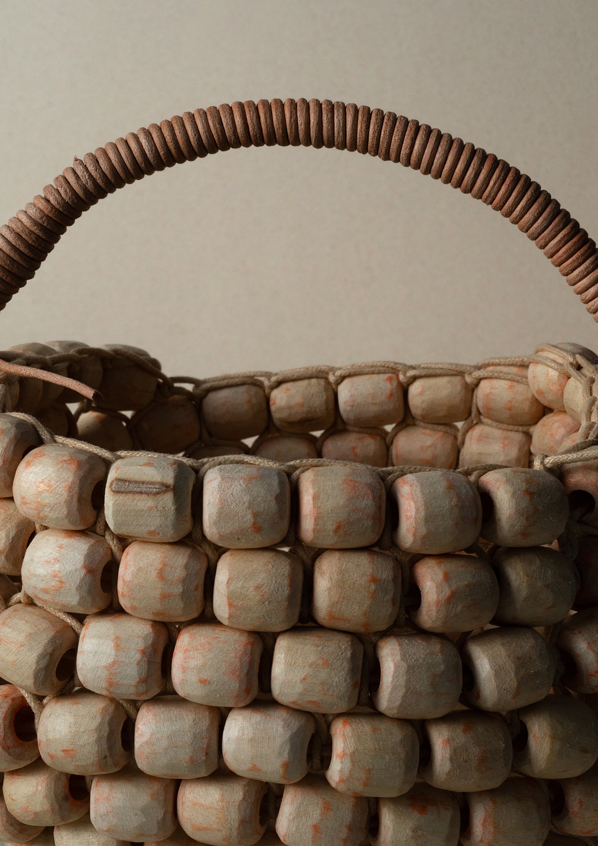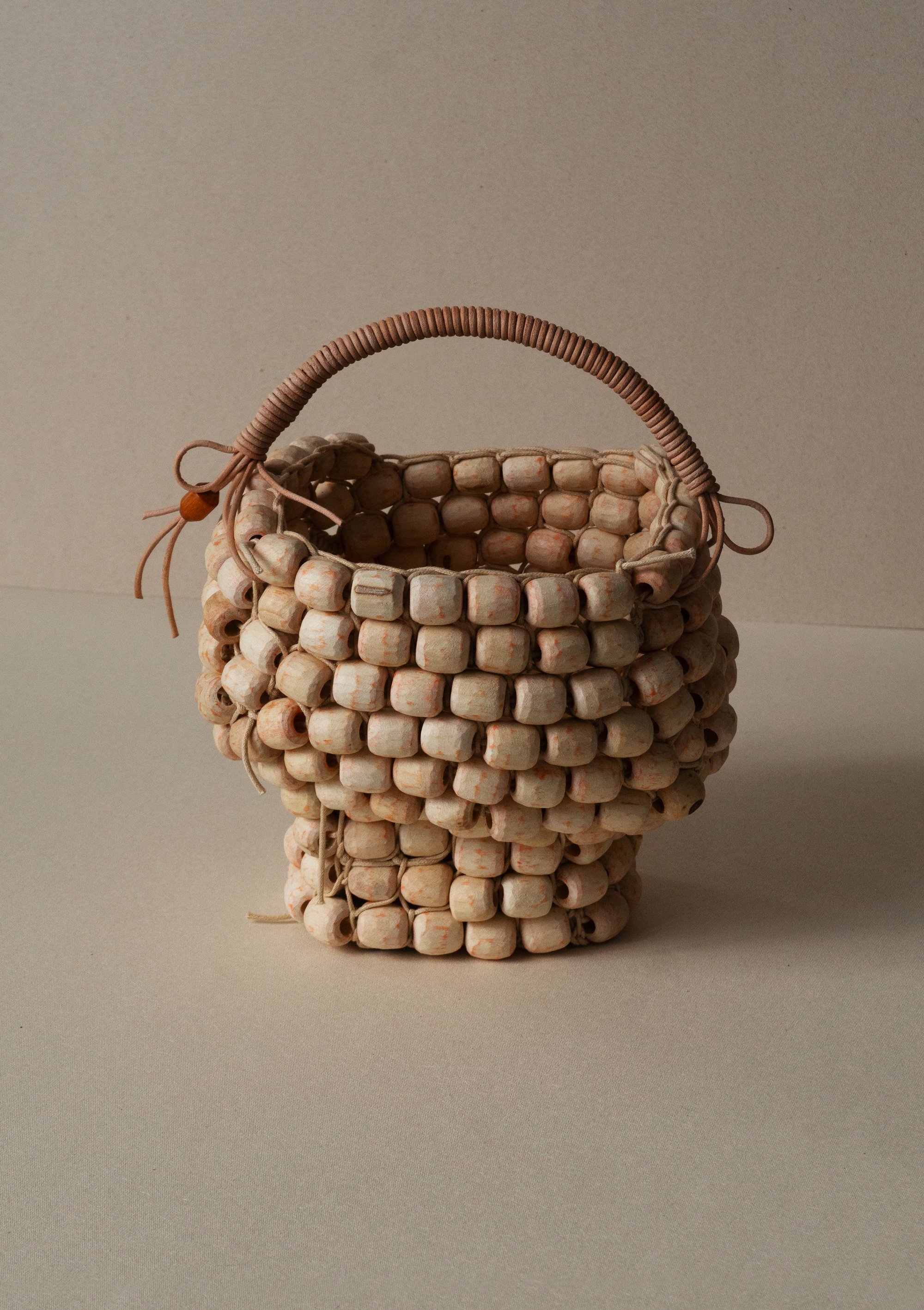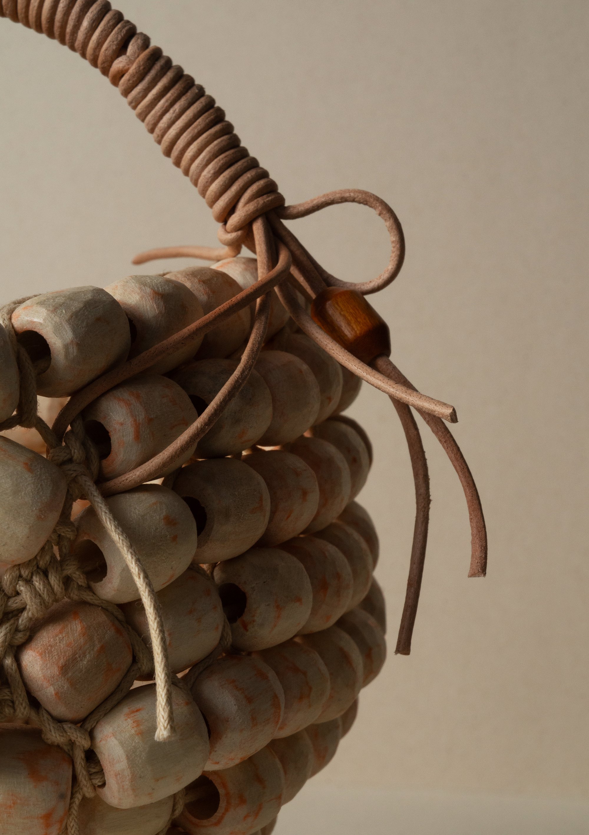 Les perles sont tissées entre elles avec des fils, la maille est montée de sorte que les perles ne puissent pratiquement plus bouger, l'assemblage est rigide, même si le panier peut légèrement se déformer en fonction de la manipulation. Les perles de bois sont fabriquées à l'atelier (Mulhouse) ou proviennent de colliers et bracelets trouvés dans des ressourceries locales. Les dimensions et essences peuvent varier. L’assemblage est réalisé à la main, à Mulhouse, en Alsace. Le bois est protégé par une préparation à base de cire d’abeille.