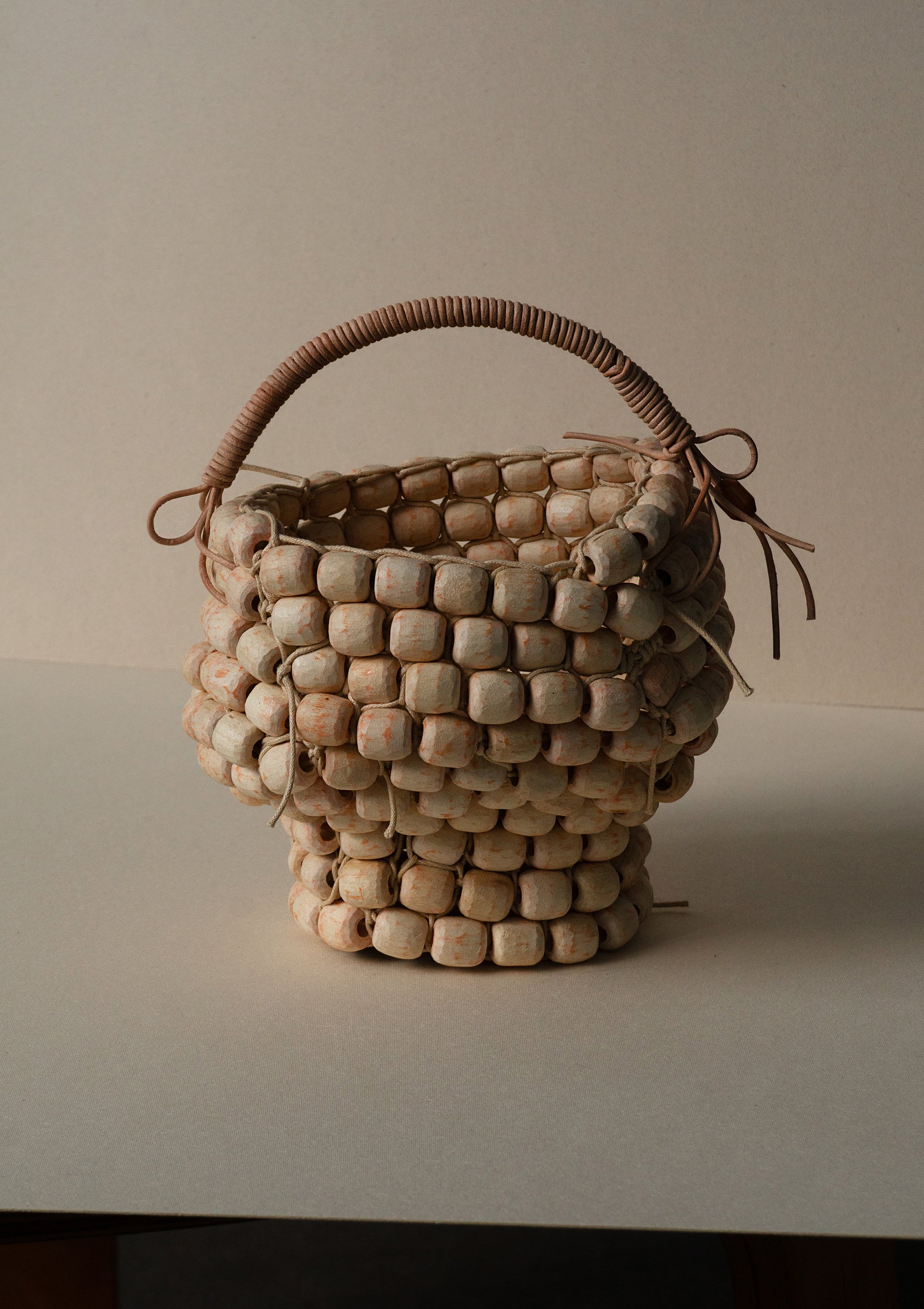 these objects in wooden pearls reminds me of the past, the old wicker baskets I used to see, but it is like a new version of my memories. At first I was trying to make knitted objects, but they were too easily deformed. the pearls are also knitted, but the objects are stronger, the shape doesn’t move if you manipulate the basket or the bowl. The assembly technique is new (I think) and quite meticulous, but it is important for me to work on basic and useful objects, objects you would like to collect, to use and also to feature at home. I hope, later, these baskets will becoming old baskets, and perhaps, some kids will be inspired of these objects.