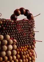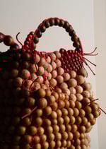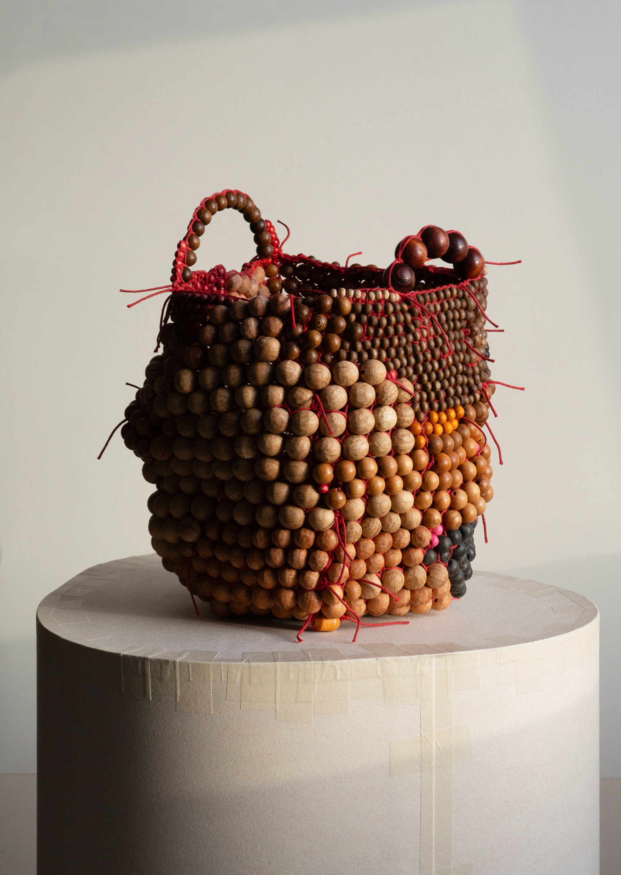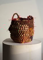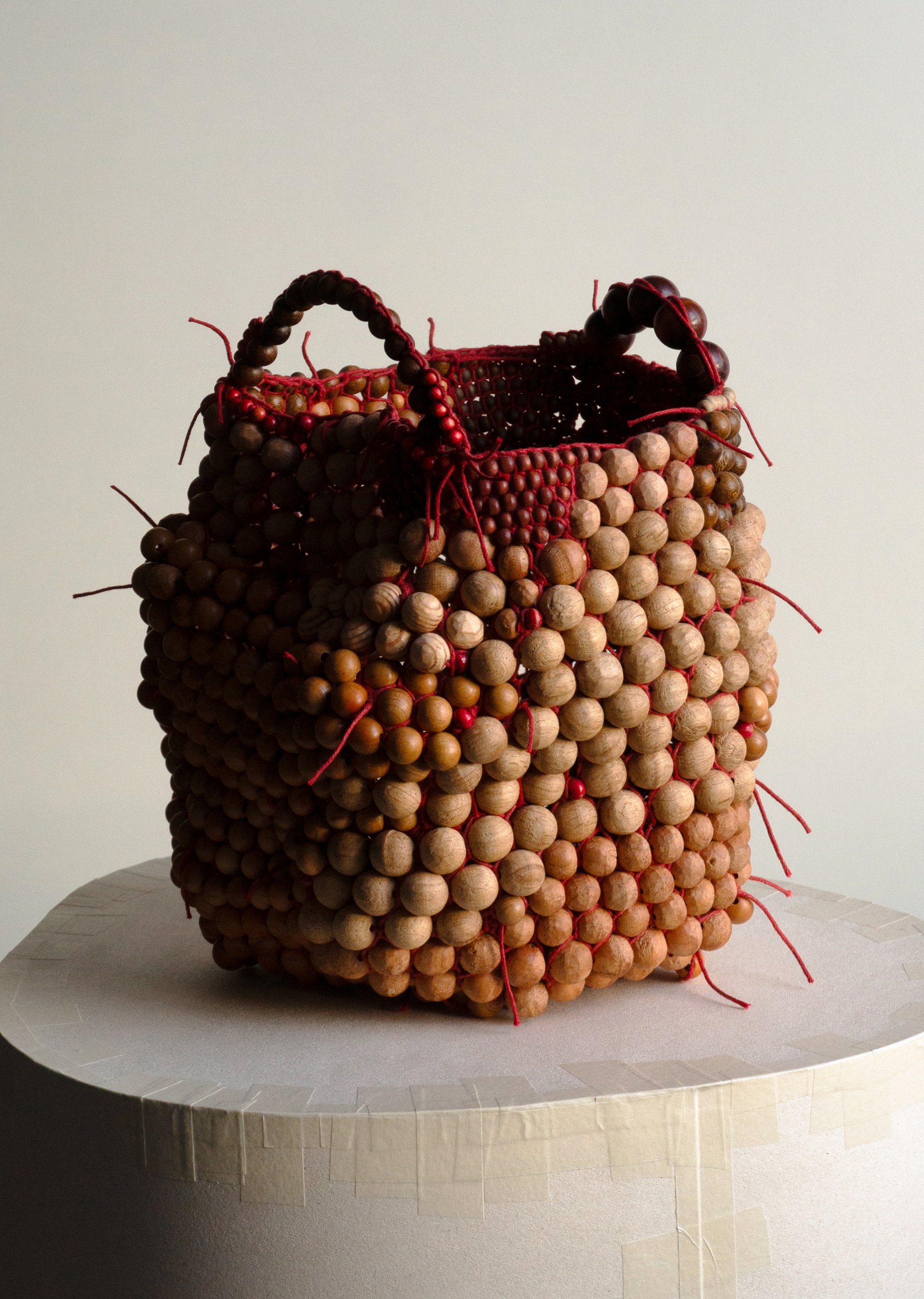 Les perles sont tissées entre elles avec des fils, la maille est montée de sorte que les perles ne puissent pratiquement plus bouger, l'assemblage est rigide, même si le panier peut légèrement se déformer en fonction des manipulations. Les perles de bois sont fabriquées à l'atelier (Mulhouse) ou proviennent de colliers et bracelets trouvés dans des ressourceries locales. Les dimensions et essences peuvent varier. L’assemblage est réalisé à la main, à Mulhouse, en Alsace. Le bois est protégé par une préparation à base de cire d’abeille.