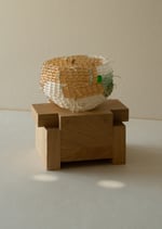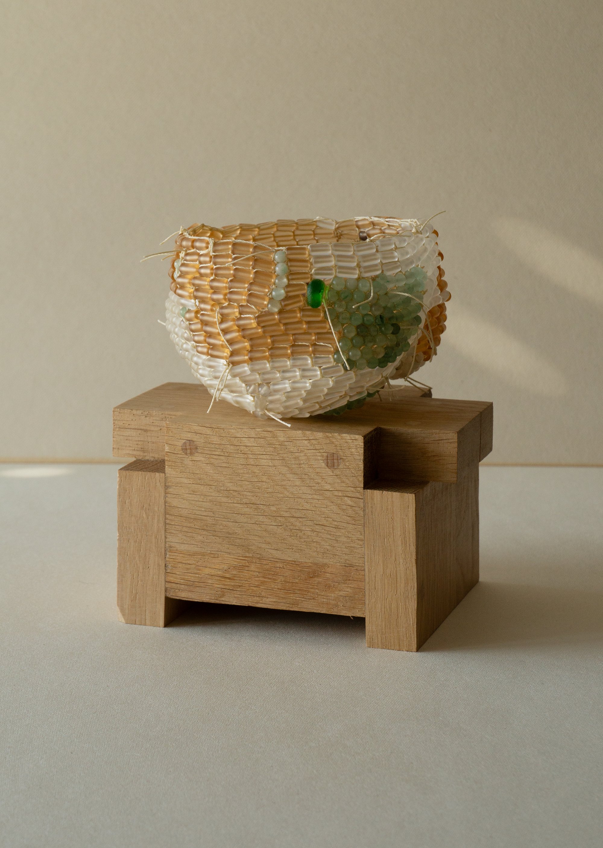 bol perles verre blanc, verre teinté, pierre Jade, fil coton ciré, socle bois chêne, chevilles hêtre, cire d’abeille.