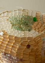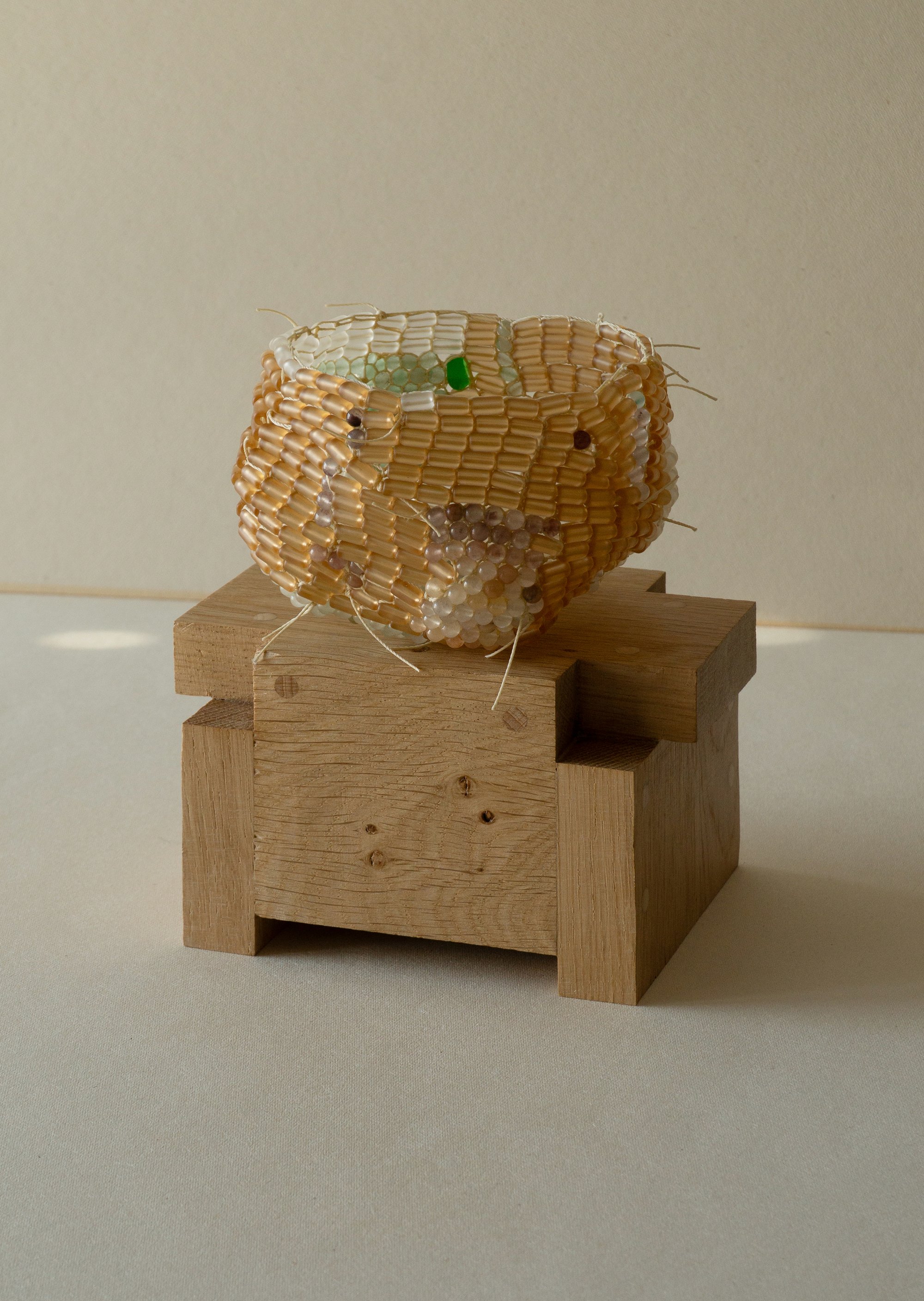 These objects in pearls reminds me of the past, the old wicker baskets I used to see, but it is like a new version of my memories. At first I was trying to make knitted objects, but they were too easily deformed. the pearls are also knitted, but the objects are stronger, the shape doesn’t move if you manipulate the basket or the bowl. The assembly technique is new (I think) and quite meticulous, but it is important for me to work on basic and useful objects, unique pieces you would like to collect, to use and also to feature at home. I hope, later, these baskets will becoming old baskets, and perhaps, some kids will be inspired of these objects.
