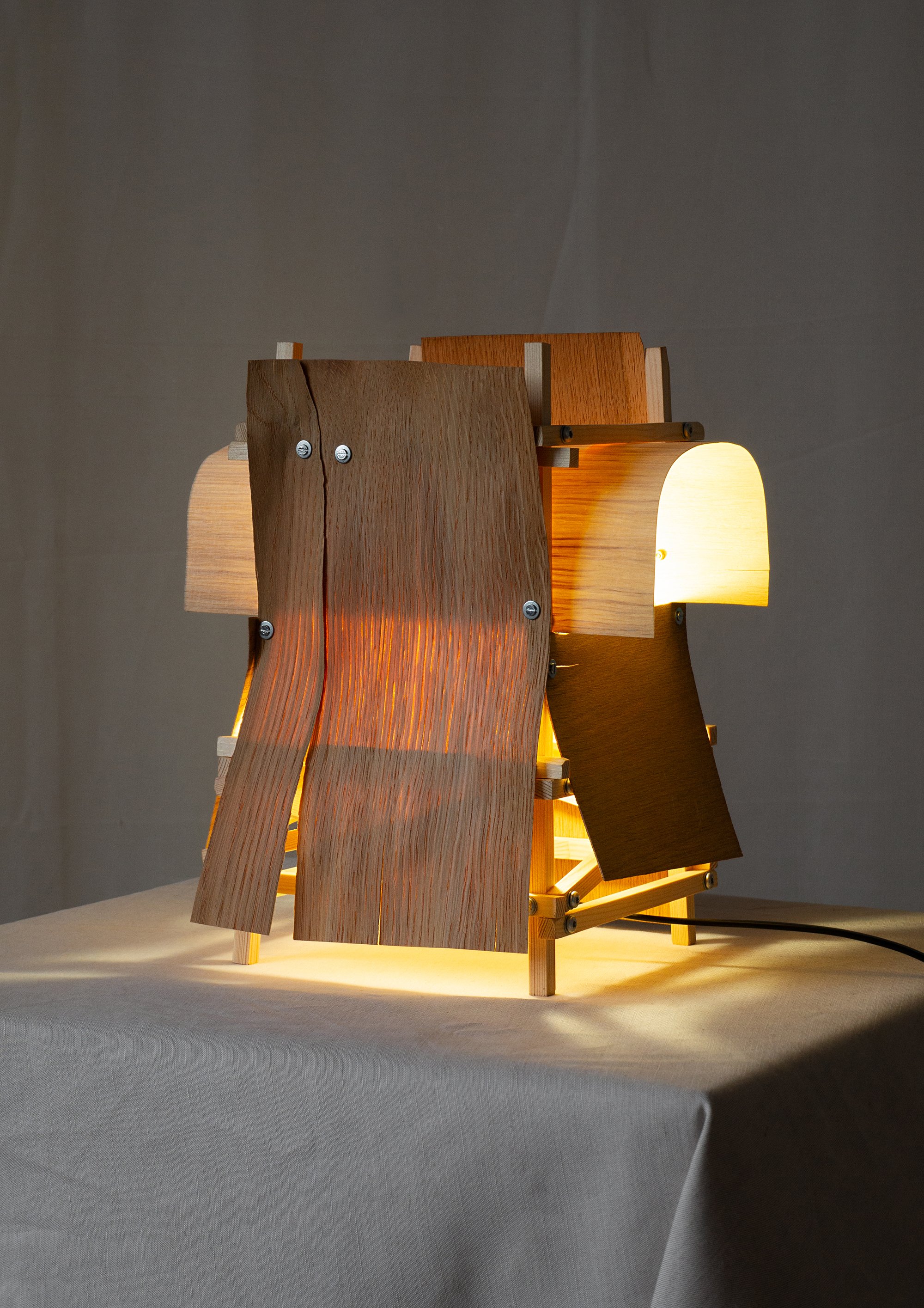 bois sapin, chêne, bouleau, vis + rondelles acier, laiton, cire d’abeille, cable d'alimentation 10m, ampoule LED E14.
